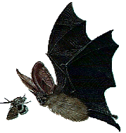 The Bat! Yes, people cringe when they hear the name! Bats really aren't bad at all, some people even consider them cute! If we did not have bats, we would be over run with dreadful bugs! (Mosquitos, Moths, Crickets, and lots of other flying bugs.) ~ Bats are the ultimate backyard preditor. They can eat up to 600 mosquitos in one hour! |